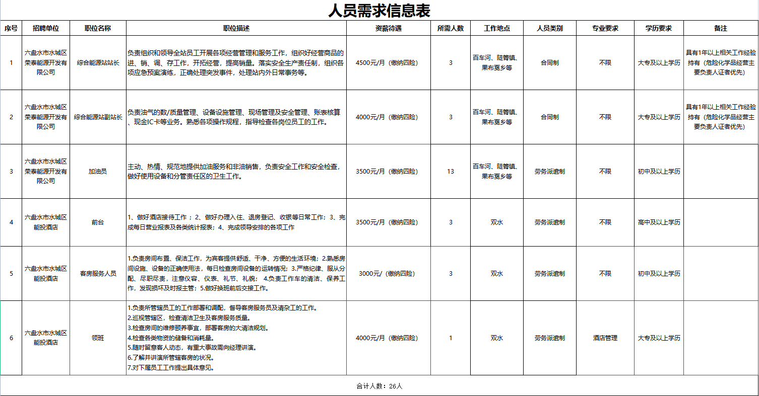 六盤水市水城區(qū)能投實業(yè)(集團)有限公司面向社會公開招聘26名工作人員